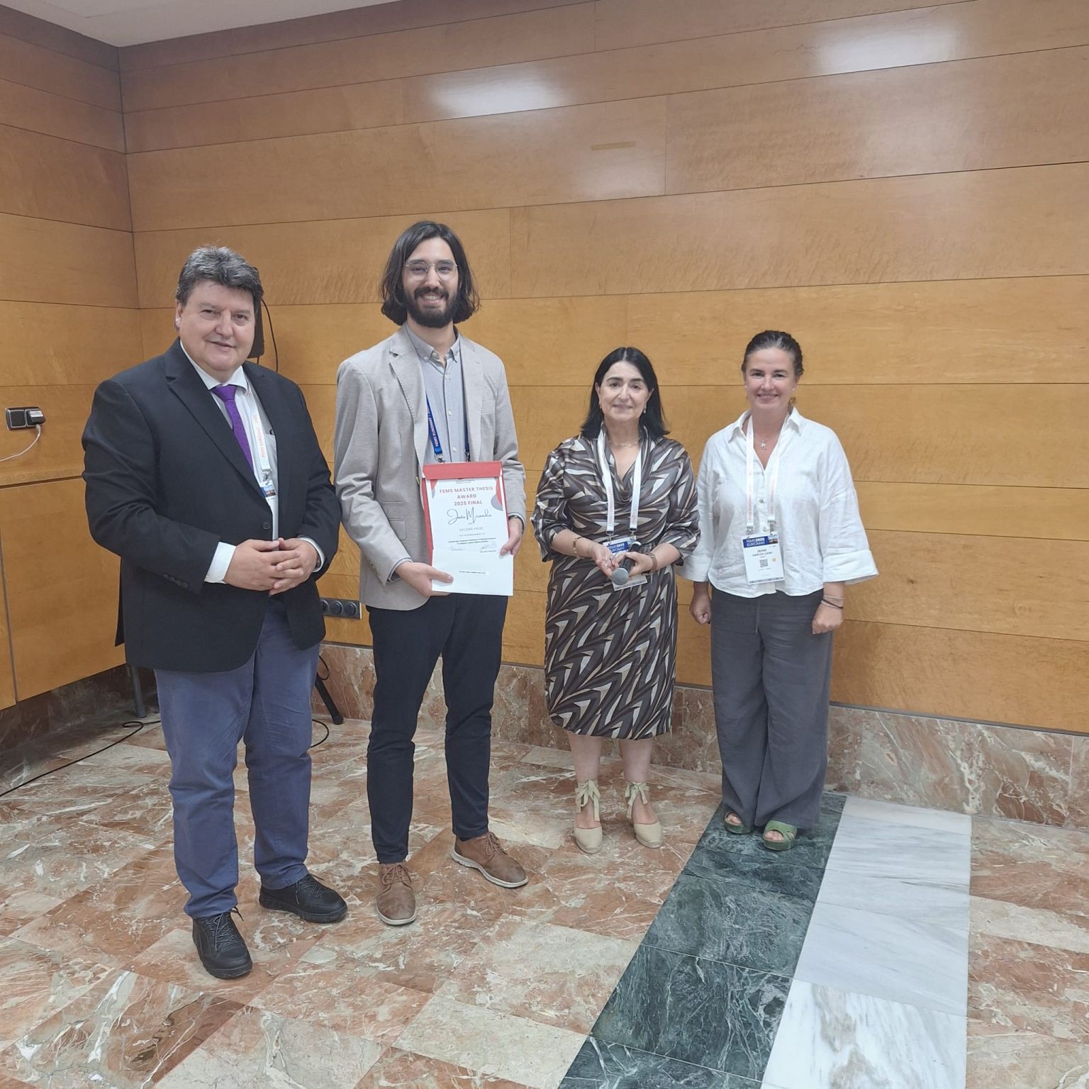 João Lopes Miranda, membro da Sociedade Portuguesa de Materiais (SPM) e atualmente doutorando no CICECO – Instituto de Materiais de Aveiro e no Departamento de Engenharia de Materiais e Cerâmica - DEMaC (Universidade de Aveiro), conquistou o 2.º lugar no FEMS Master Thesis Award 2025, um prestigiado concurso europeu que distingue teses de mestrado de excelência em ciência e engenharia de materiais. A cerimónia de entrega dos prémios decorreu durante o FEMS EUROMAT 2025, em Granada, Espanha.